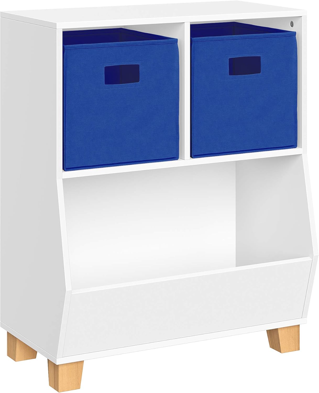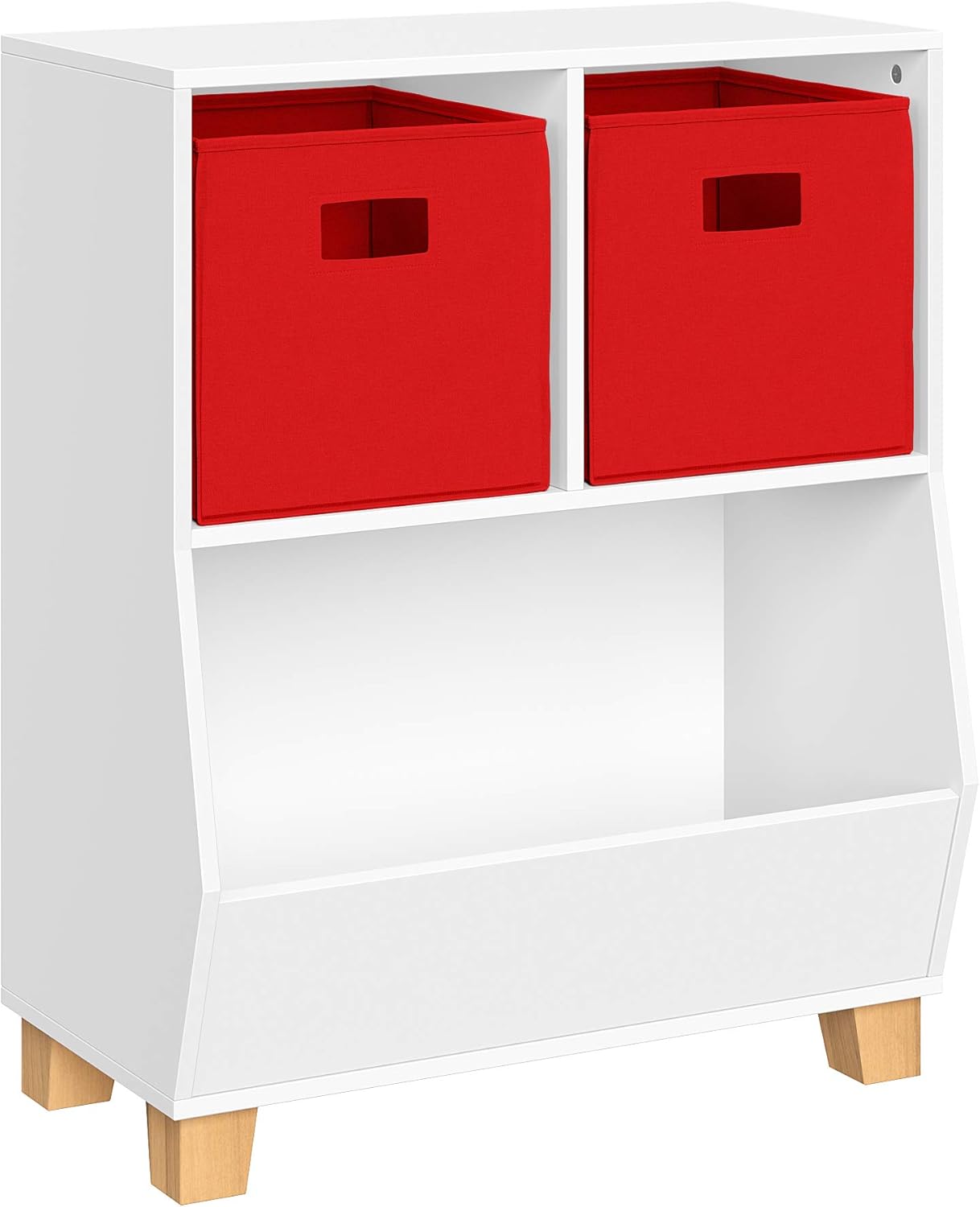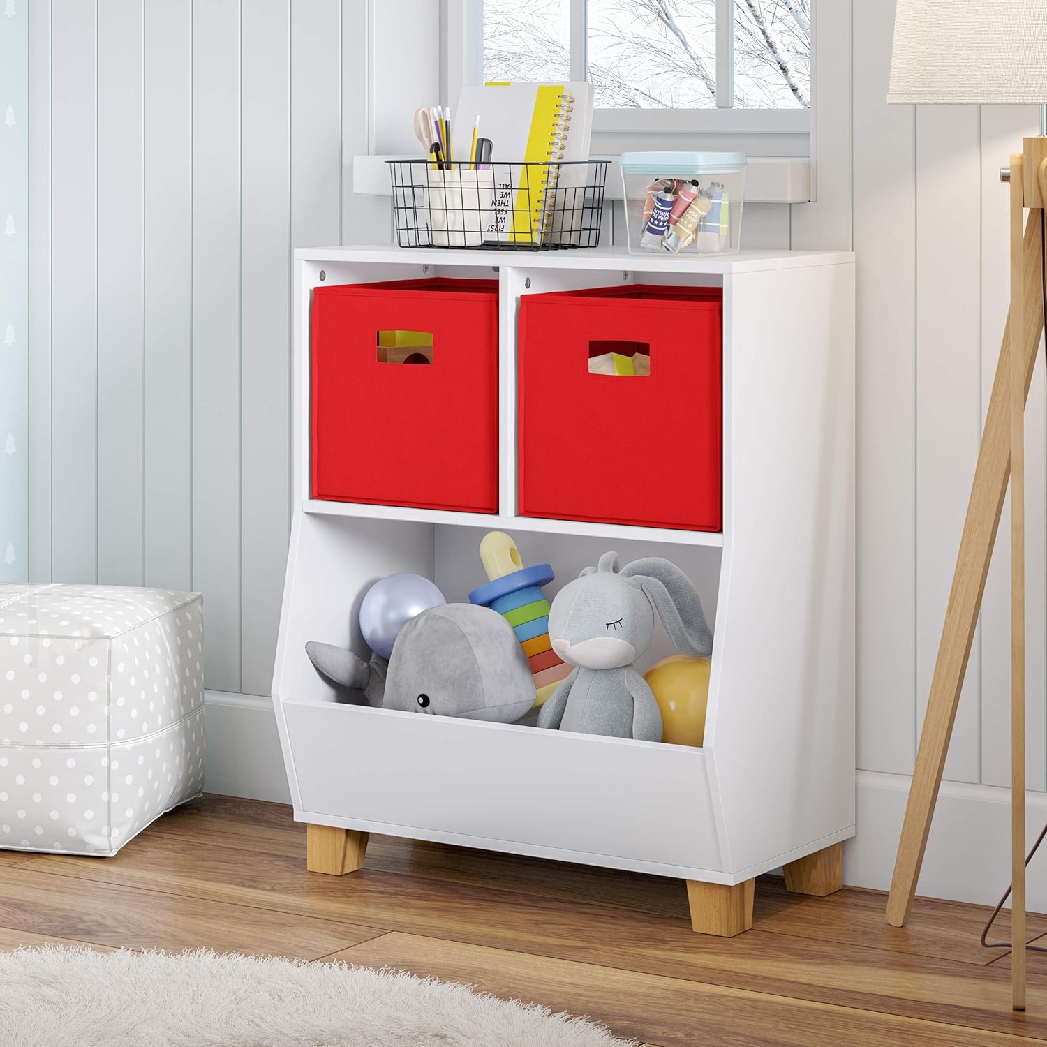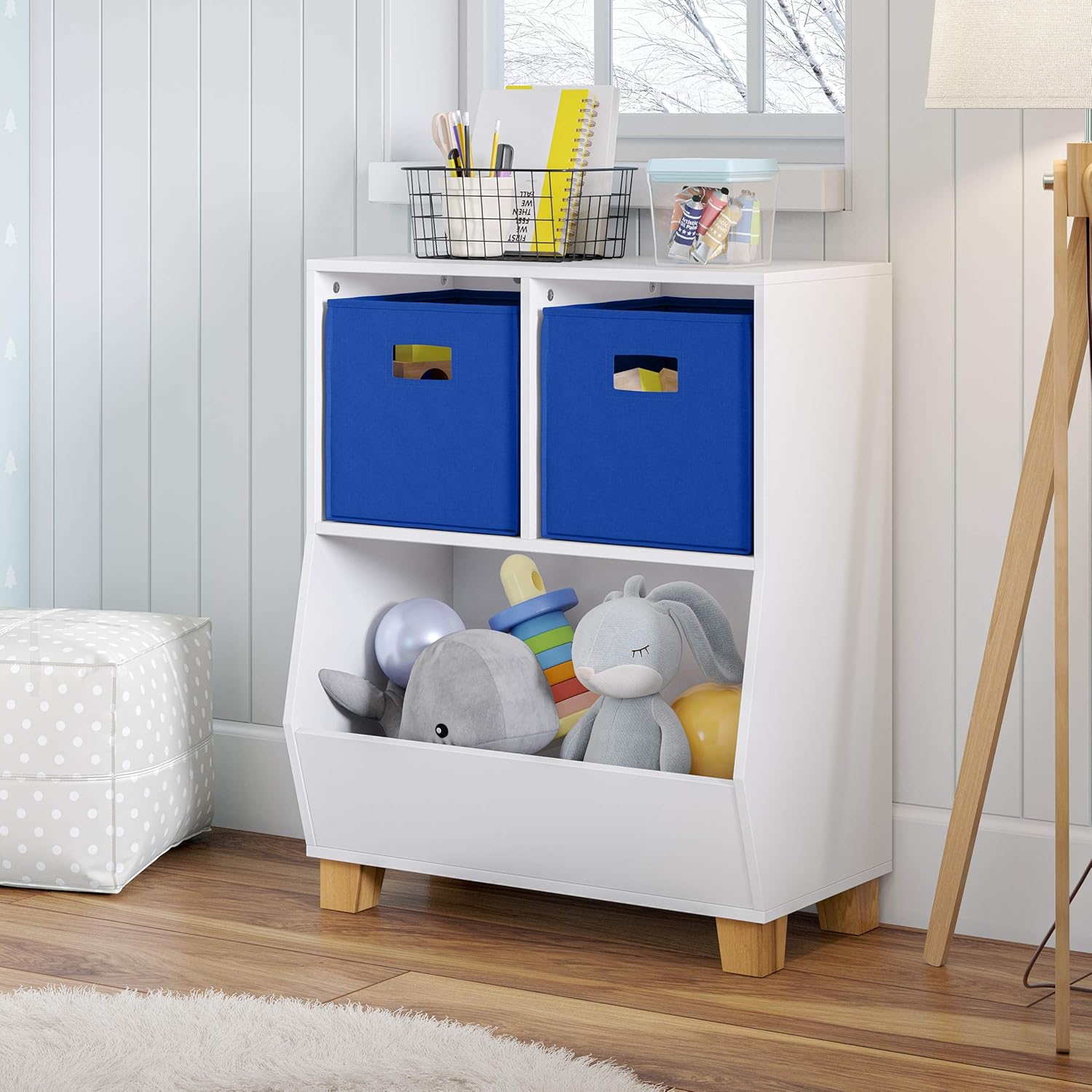 Tidy Playroom Solution Restore order to your child's playroom with the Kids Catch-All Multi-Cubby 24in Toy Organizer from RiverRidge. Our versatile kids book storage and toy organizer features two square cubbies and a spacious lower compartment, providing ample space to neatly arrange books, puzzles, games, and more. The clean white finish and solid pine wood legs complement any decor, making it a stylish addition to your kids space. Playful Organization Elevate your kids' playroom furniture with the Kids Catch-All Multi-Cubby 24in Toy Organizer. Standing at 29.1 inches tall, our sturdy organizer is the ideal height for little ones to access their belongings independently. Secure it to the wall using the included anchors for added safety and stability. Our RiverRidge fabric folding bins provide additional storage to conceal clutter and inject vibrant pops of color into the room. Clutter-Free Cubby Simplify storage and keep your child's space tidy with the Kids Catch-All Multi-Cubby 24in Toy Organizer from RiverRidge. Our cubby storage organizer features two roomy square cubbies and a spacious lower bin, providing ample space to organize toys, books, and games. With its modern design and versatile white finish, our organizer seamlessly blends into any playroom decor while keeping clutter at bay. Width of Cubes: 10.9 inches Height of Cubes: 11.25 inches Depth of Cubes: 10.75 inches Width of Bin: 22.4 inches Height of Bin: 14 inches Depth of Bin: 12.1 inches